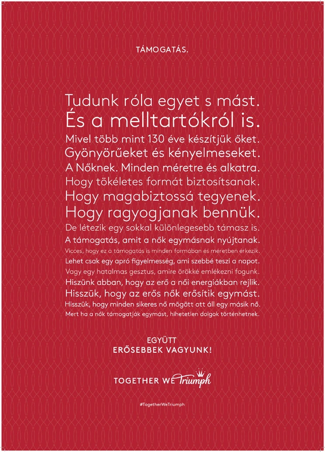 Az elmúlt 130 évben a Triumph töretlenül támogatta a nőket, termékeikkel magabiztosságot kölcsönözve viselőinek, különösen ügyelve arra, hogy kínálatuk minden méretben és formában elérhető legyen. A tervezéstől a fejlesztésen át a kivitelezésig több mint ezer kollégájuk dolgozik azt szem előtt tartva, hogy együtt, összefogással minden lehetséges. A most induló #TogetherWeTriumph célja, hogy a nőket ünnepelje világszerte.