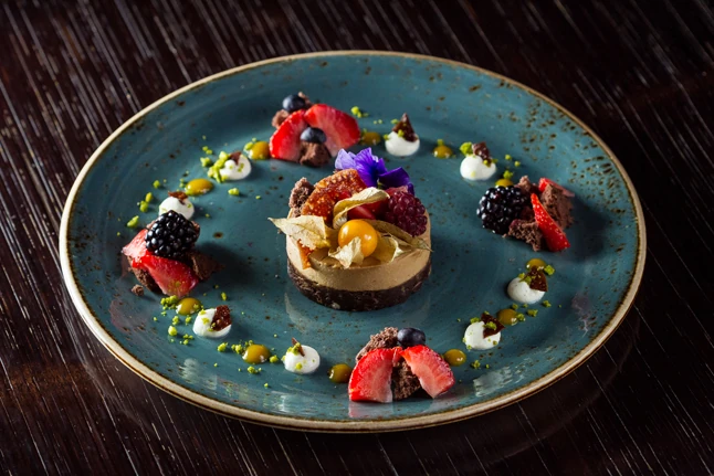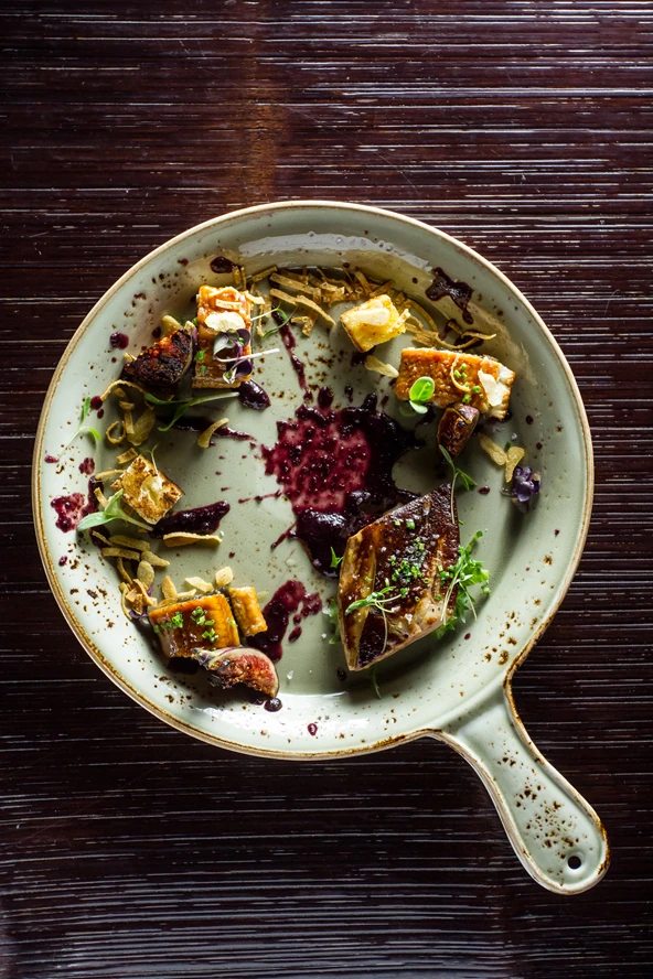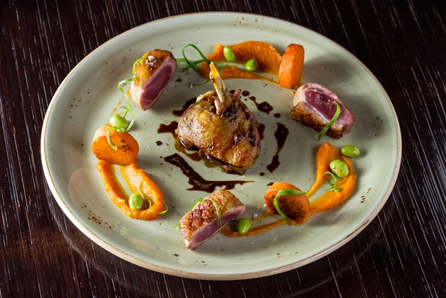 • Főétel: Konfitált kacsacomb és sült kacsamell sütőtökkel, chilis-csokoládés szósszal, Noriba tekert tonhal articsókával és panzu szósszal