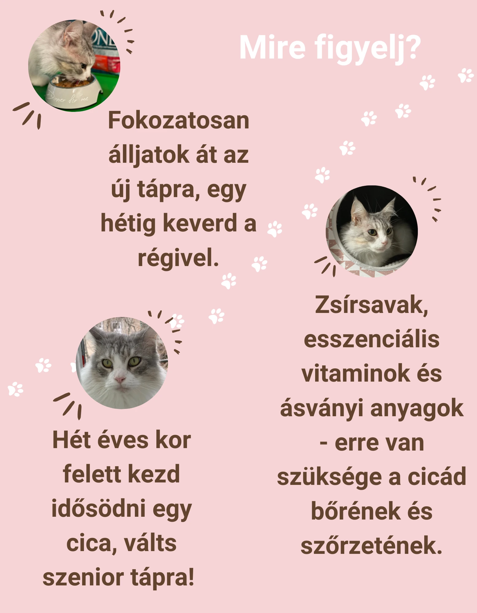 Nádja cica lassan betölti a hetedik életévét, de kondíciója a 3 hetes program lezártával szinte kirobbanó. Bordái kitapinthatóak, szépen megfigyelhető a csípő és minimális a bőr alatti zsírszövet réteg. A Purina ONE állatorvosától, dr. Márton Kingától megtudtuk, hogy a macskákat hét éves koruktól tekintjük idősödőnek, így célszerű a korának megfelelő, szenior eledelre váltani, és ezzel párhuzamosan beiktatni a rendszeres állatorvosi szűrővizsgálatokat is. Az idős állatok számára készült eledelek az ilyen korú cicák emésztési sajátosságaihoz igazodva magas, könnyen emészthető és jól értékesülő fehérjetartalommal bírnak, valamint tartalmaznak esszenciális zsírsavakat, mikroelemeket és vitaminokat az immunrendszer működésének segítésére.