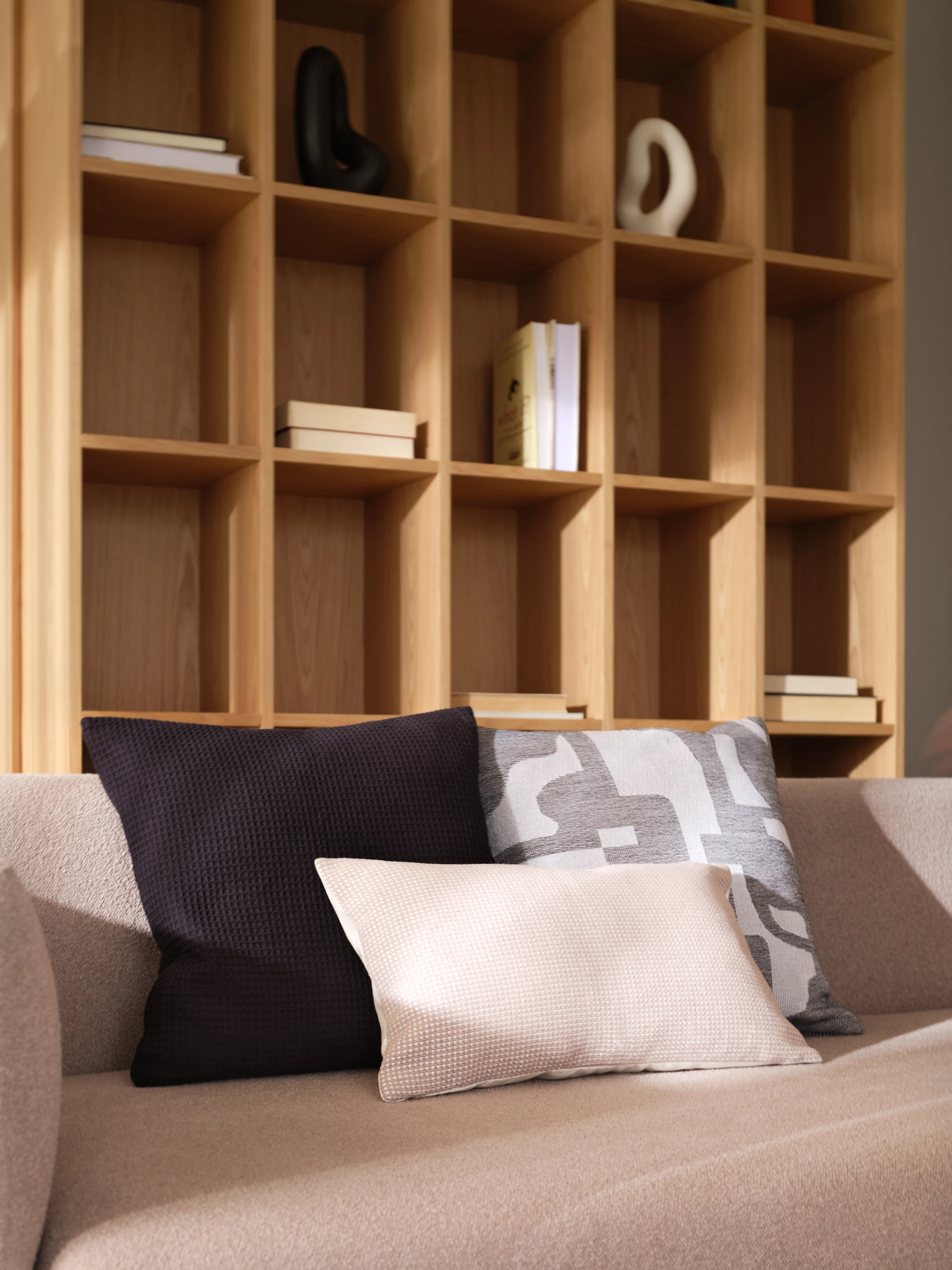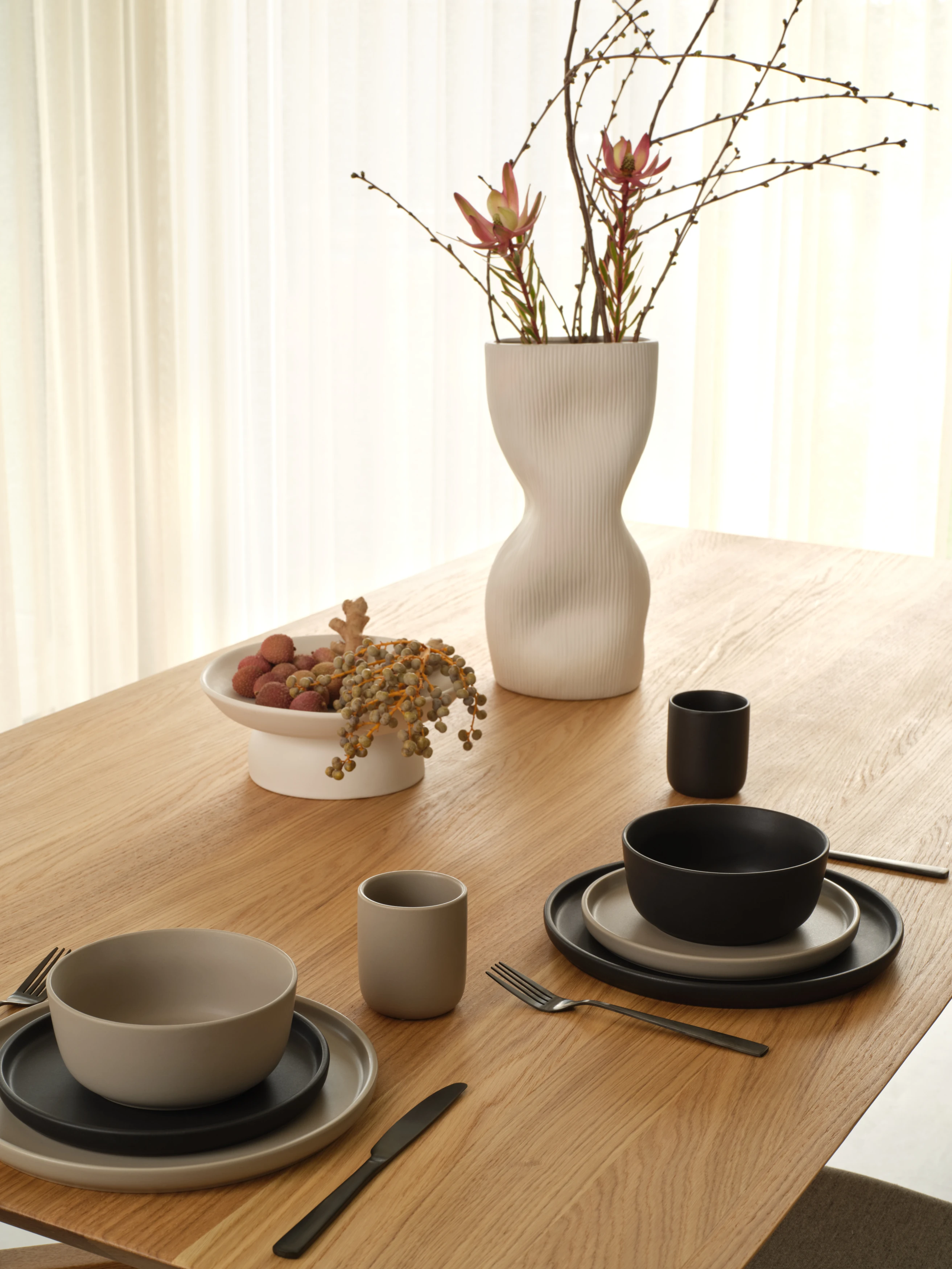 A kollekció alapját a szürke és a bézs árnyalatai alkotják durva, textúrált és organikus formában, finom zölddel, valamint a fa szabálytalan és meleg jegyeivel kiegészítve.