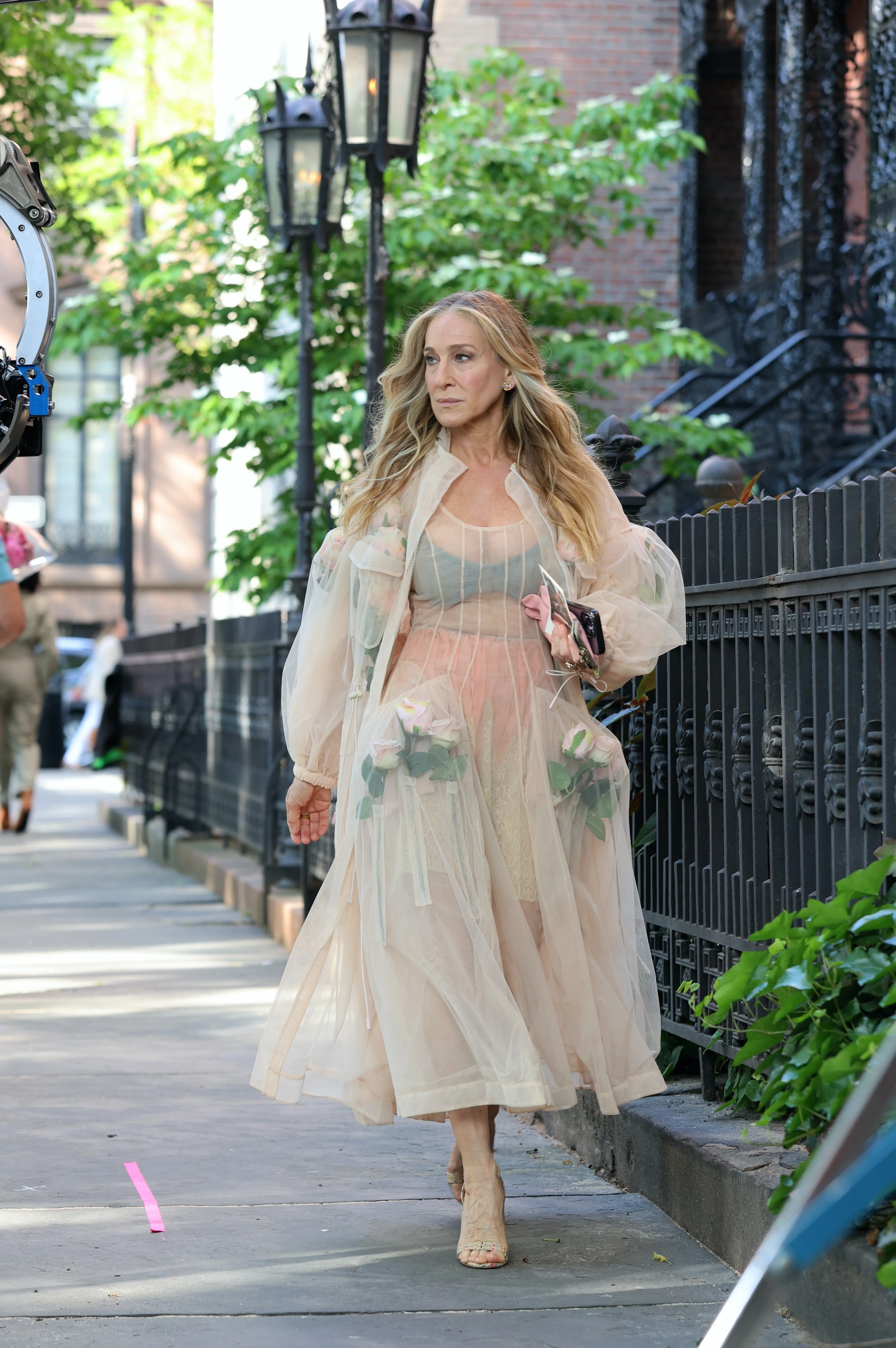 SJP egy krémszínű, szinte teljesen áttetsző, rózsákkal díszített Simone Rocha kabátban és ruhában sétálgatott New York utcáin, ami teljes egészében láttatni engedte sötét színű melltartóját és narancssárga bugyiját. A sikkes, mégis kissé extrém outfit láttán pedig akkor is teljesen biztosak lennénk abban, hogy a színésznő ismét Carrie bőrébe bújt, ha nem tudnánk!