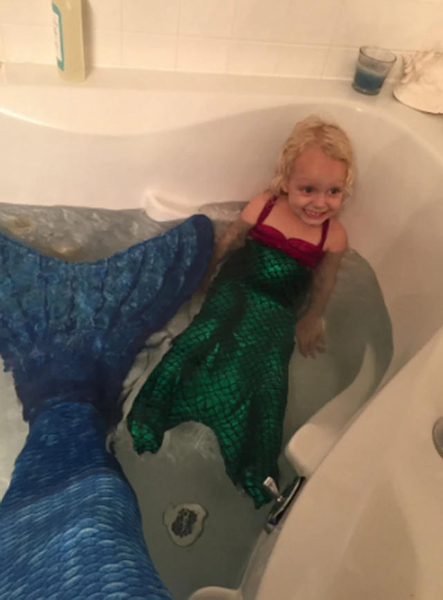 A kislány óriási Kis Hableány-rajongó, és legszívesebben sellőruhájában flangál egész nap, így Keegan úgy gondolta, előszedi a saját hableányruháját, és abban fürdeti meg Alidy-t.