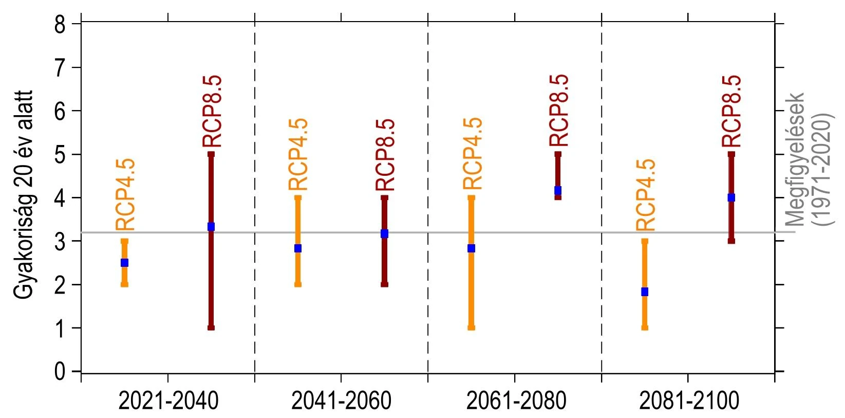 Ha a kibocsátásokat továbbra is a mostani szinten folytatjuk, akkor 2060-tól a jelenlegi átlagosan 3 év helyett inkább 4 évben számíthatunk húszévente súlyosan aszályos félévre a vegetációs időszakban.