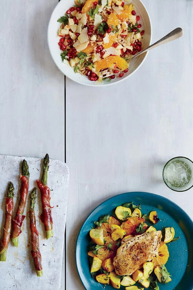 Hozzávalók egy adaghoz: másfél csésze főtt tönkölybúza, fél csésze gránátalmamag, fél csésze apróra vágott alma, fél evőkanál kendermag, 3 db narancscikkely, 2 evőkanál petrezselyem, 1 teáskanál friss citromlé, 1 teáskanál balzsamecet, fél evőkanál extraszűz olívaolaj, fél evőkanál Pecorino sajtforgács