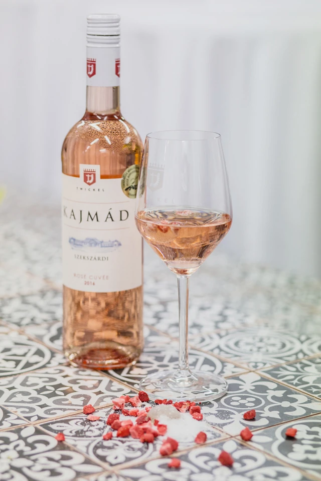 Hozzávalók: 500 ml Twickel Kajmád Rosé Cuvée 2016, 6 lap zselatin, liofilizált málna vagy eper