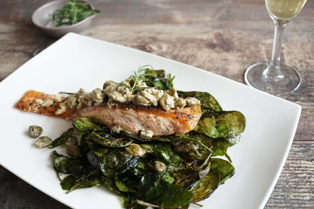 Pezsgős-kapribogyós serpenyőben sült lazacfilé, spenótchipssel