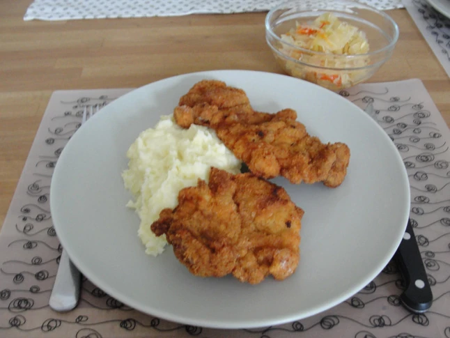 Közben elkészült a krumplipüré (krumpli, vaj, tejföl, só, szerecsendió) és szépen megsültek a húsok is. Sütéshez, főzéshez többnyire olívaolajat vagy kókuszzsírt használok, de annyira nem vagyok elszánt, hogy rántott húst vagy pörköltet is azzal készítsek, úgyhogy ma egyszerű napraforgóolajat használtam.