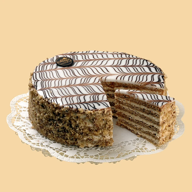 A tojásfehérjét a cukorral verd habbá, keverd hozzá a darált diót, és készíts hat darab 22 cm átmérőjű lapot, amiket süss 200 fokon 16-18 percig. A töltelékhez a hozzávalókat főzd fel, majd hűtsd le. A krémhez a tejet forrald fel, a cukrot a pudingporral és egy kevés hideg tejjel keverd simára, majd főzd fel kis lángon a forró tejhez öntve. A sűrűre főtt krémet törd át szitán, majd keverd ki vajjal. Ha megvagy, hozzákeverheted a diót és a Triple-sec likőrt, végül keverd habosra a korábban elkészített töltelékkel. Ezután állítsd össze a krémet a lapokkal rétegezve a tortát, majd az oldalát is vond be a krémmel. A díszítéshez a torta tetejére kenj lekvárt, majd langyos fondant. Végül húzz olvasztott csokoládéval párhuzamos csíkokat, majd mintázd keresztirányban egy kés hegyével elhúzva is. A torta oldalát panírozd darált dióval.