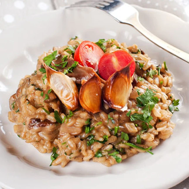 A vöröshagymát vágd apró kockákra, és pirítsd előmelegített serpenyőben, olívaolajon rövid ideig. Add hozzá a rizst, sót, fehérborsot, és folyamatos kevergetés mellett először fehérbort, majd az alaplét adagold hozzá. Főzd közepes lángon. Amikor eléri a megfelelő puhaságot, add hozzá a külön olíván megpirított vargányát, és folyamatosan krémesítsd kevés vajjal, főzőtejszínnel és parmezán sajttal. Ezalatt szedj gerezdjeire két fej fokhagymát, de nem tisztítsd meg őket. Egy hőálló edényben olajjal kicsit locsold meg, bátran sózd, borsozd, és süsd 200 fokra melegített sütőben 15-20 perc alatt. Tálald a rizottót friss petrezselyemmel és a sült fokhagymával.
