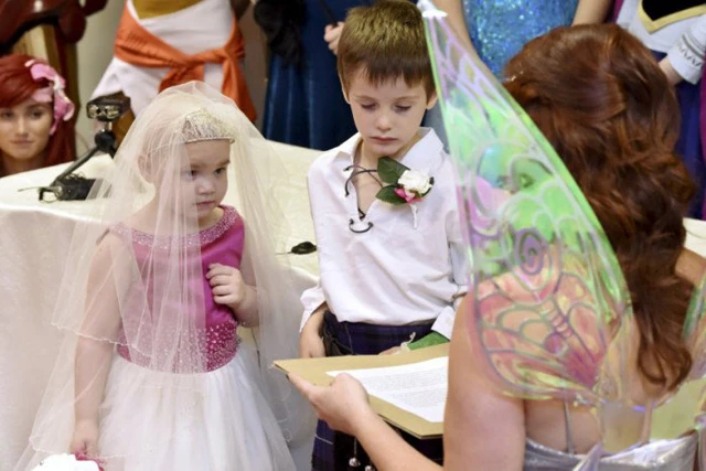 A nagy napra 30 vendéget hívtak meg, köztük királynőket, szuperhősöket és tündéreket, a szerelmesek pedig nyakláncot cseréltek. Miután örök barátságot fogadtak egymásnak és eljárták az esküvői táncot a Gangnam Style-ra, felvágták a tortájukat.