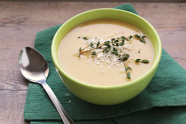 Hozzávalók 3 személynek: 8 dkg fokhagyma, 12 dkg emmentáli sajt, 4 dl 1,5%-os tej, 2,5 dl 20 %-os főzőtejszín, 1 db leveskocka, 1 dkg étkezési keményítő, bors, só, 3 dl víz