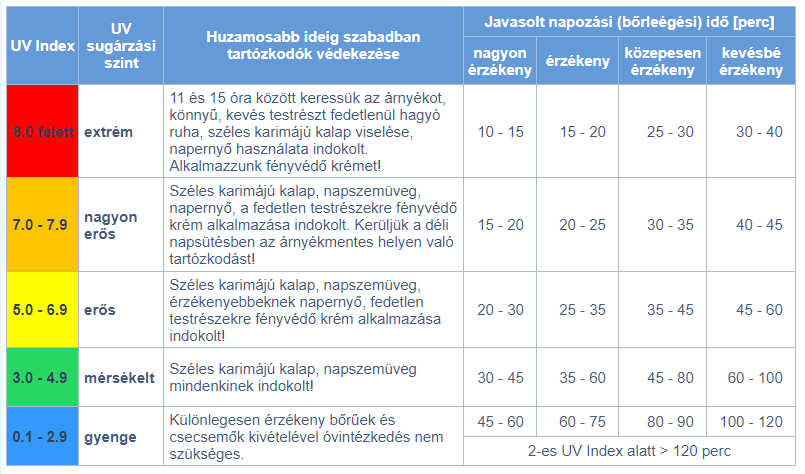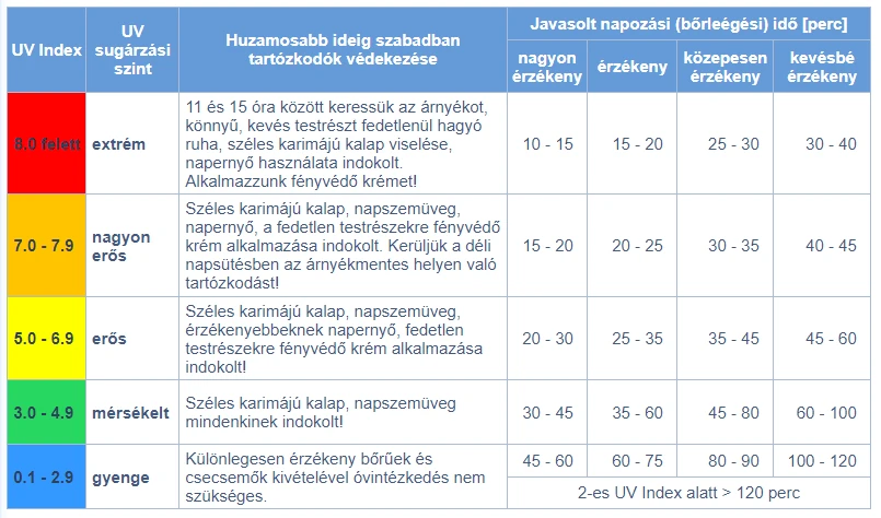 Arról, hogy milyen az UV sugárzási szint és mennyi időt tölthetünk a napon anélkül, hogy leégnénk, az UV index ad információt. Az aktuális és az előrejelzett értékekről az Országos Meteorológiai Szolgálat honlapján tájékozódhatunk.