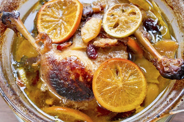 Hozzávalók: 1 pecsenye kacsa, 2 db narancs, 1 dl fehérbor, 2 evőkanál cukor, olaj, só