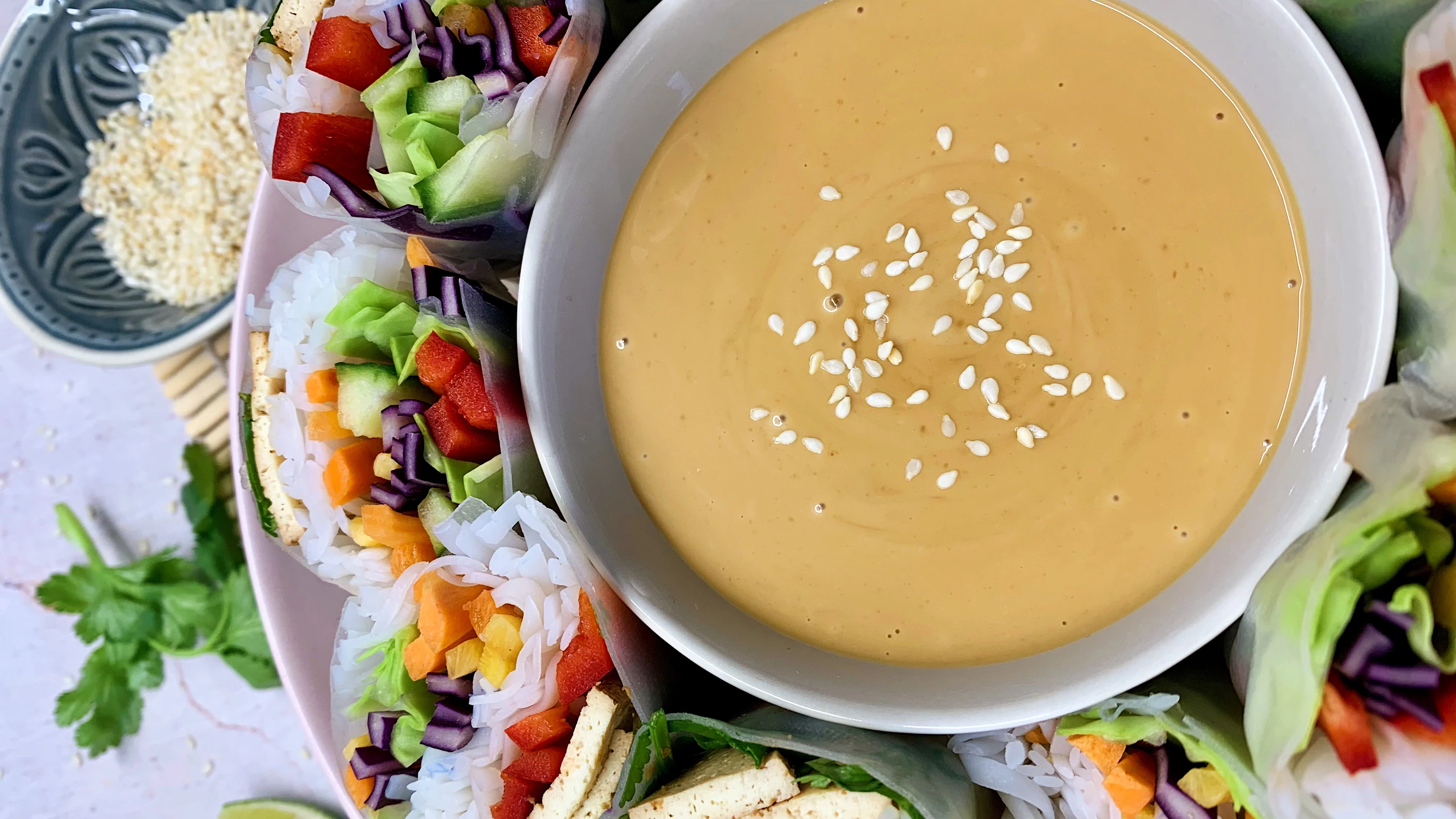 Szivárványszínű vietnámi nyári tekercs, mogyoróvajas mártogatóssal