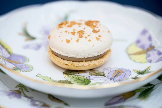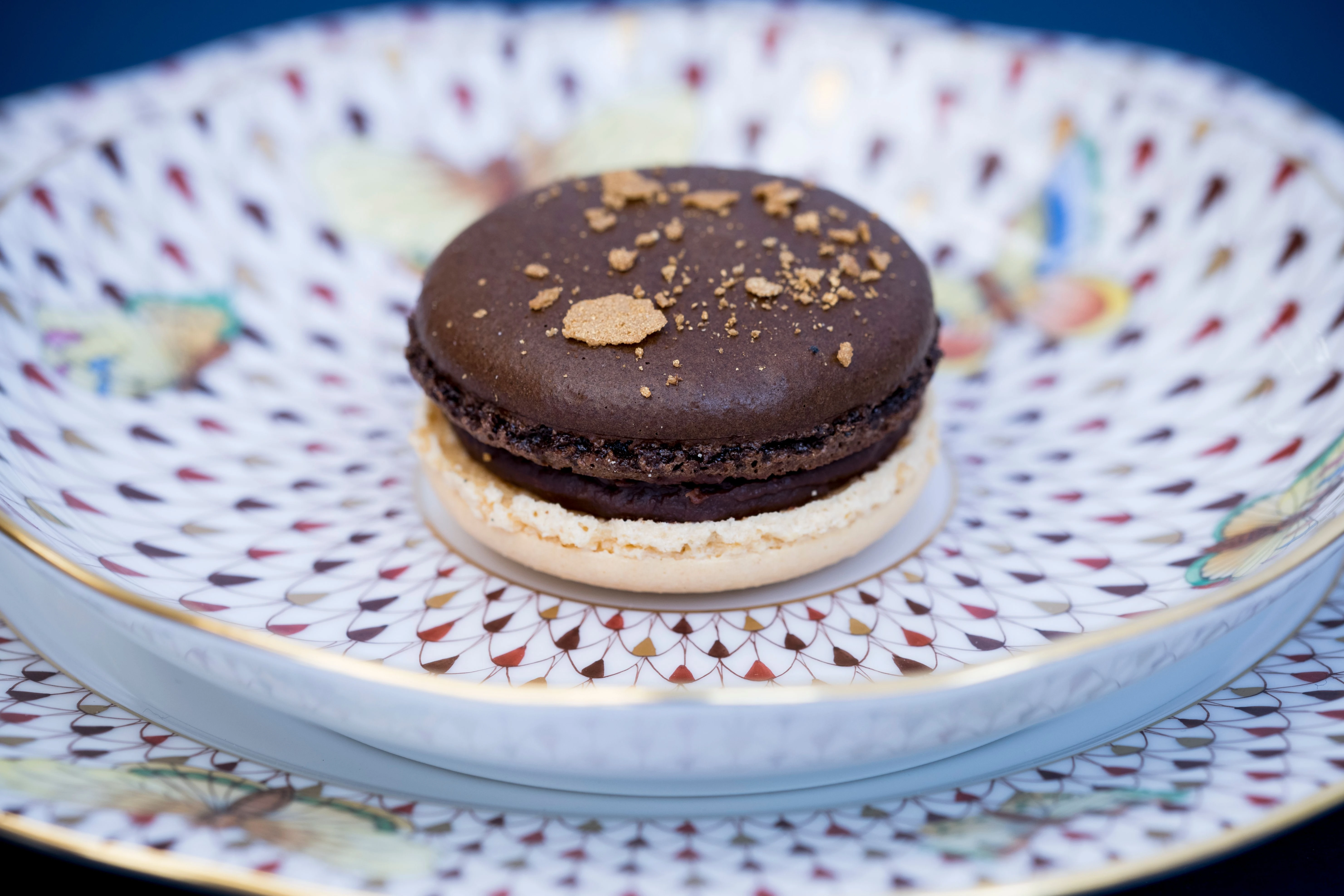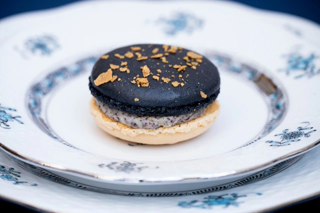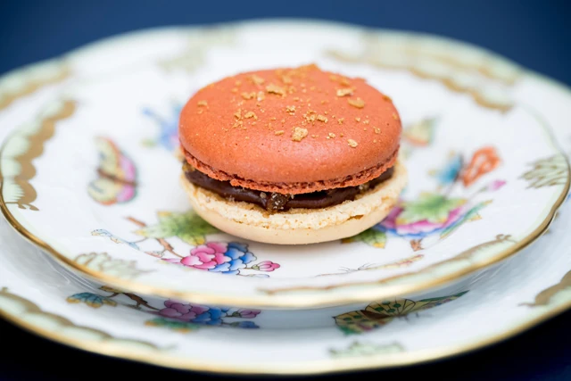 A Dobos-torta macaronunkat igyekeztünk úgy készíteni, hogy visszahozza az eredeti desszert ízét és textúráját. Az alapjához a Valrhona Guajana csokoládéját és kakaóvajat használtunk, hogy egy igazán selymes, lágy krémet kapjunk. Hogy egy icipici macaronban is teljes legyen a Dobos élmény, isteni házi karamellbe forgattunk sablé töretet, mellyel beterítettük a macaron egész csokoládés alapját és így helyeztük rá a másik roppanós mandulás kalapkát.