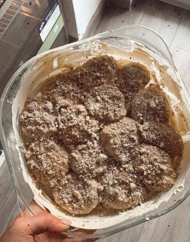 3. Kivajazott tepsibe vagy hőálló edénybe teszed sűrűn, egymás mellé a kis "pogácsákat" (előtte megszórod a tepsi/edény alját is dióval)