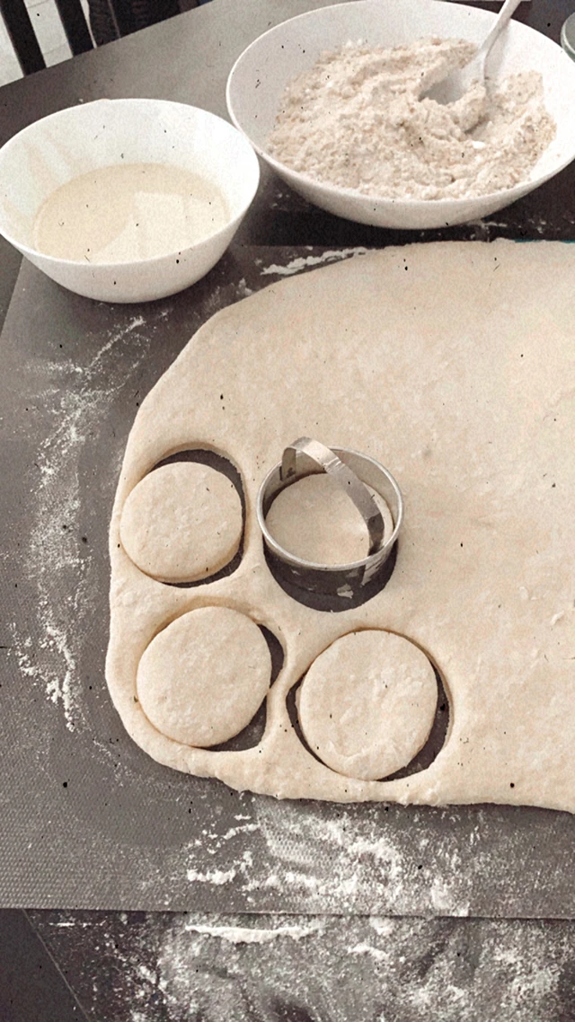 Felfuttatod az élesztőt. (Belemorzsolod a langyos tejbe az élesztőt, majd letakarod és pár perc alatt fel is fut. Mindezt például egy bögrében teszed.) A hozzávalókat beleöntöd egy tálba, majd alaposan összegyúrod. 1 órát pihenteted/keleszted letakarva a tésztát meleg helyen. (Én mindig a takaró alá teszem.) Ha megkelt, ujjnyi vastagra kinyújtod egy belisztezett deszkán és pogácsaszaggatóval kiszaggatod.