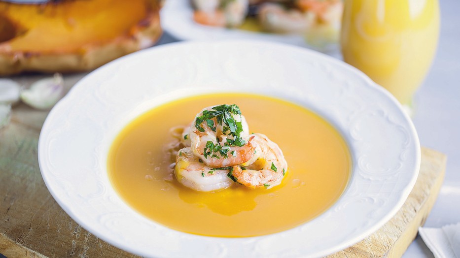 Narancsos sütőtök krémleves petrezselymes fokhagymás rákkal