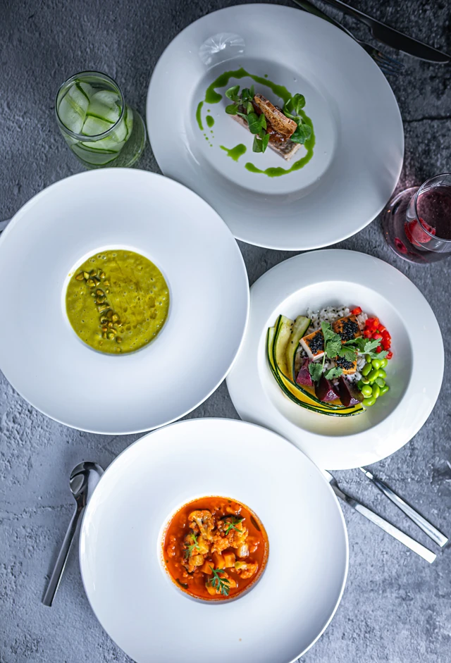Előételek: Karfiolleves (Magyaros karfiolleves zöldségek), Krémleves ( Hideg cukkini krémleves pisztácia), Poke Bowl (poke bowl saláta, tofu, zöldségek), Rillette (Rillette csatni, kruton)