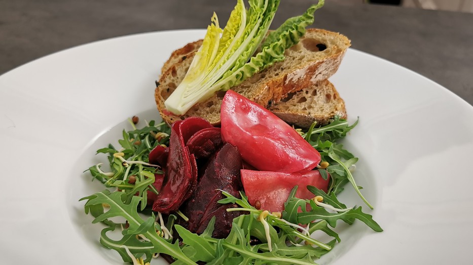 Hozzávalók a páchoz: füstolaj 1,5 deci, szójaszósz 4 deka, datolyaszirup 4 deka, mustár 4 deka, balzsamecet 2 evőkanál, sörélesztőpehely 4 evőkanál, fokhagyma 2 gerezd, egy fél citrom leve. A zöldségszeletekhez: cékla 60 deka, vajretek 3 db. A tálaláshoz: rukkola 5 deka, zöld saláta, csíra és friss kenyér. A füst olaj házi készítéséhez: 1 liter, olívaolaj, 5-6 db faszén