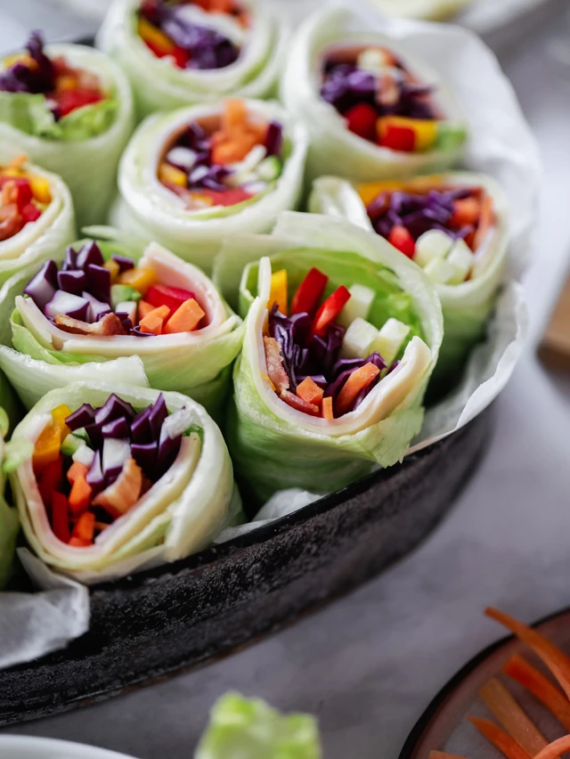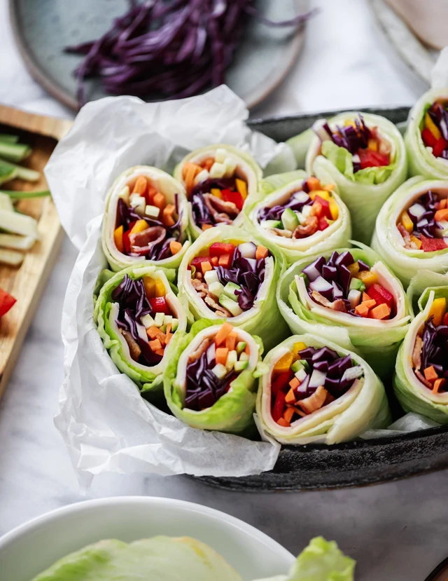 3. Minden zöldségből egy keveset keresztbe ráfektetünk a bacon tetejére, majd szorosan feltekerjük a salátát, és megtűzzük fogpiszkálóval.