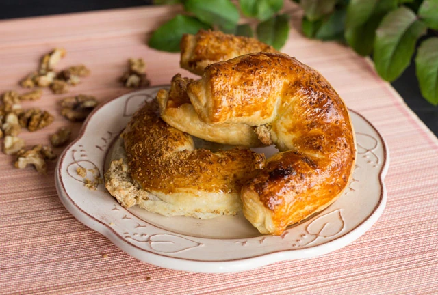 Hozzávalók 16 kiflihez: 2 tojás, 15 dkg porcukor, 15 dkg darált dió, 2 csomag 500 g-os fagyasztott leveles tészta a tetejére: kb. 5 dkg darált dió