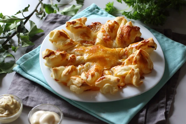 Vágj ki két körformát egy tortaforma segítségével. Szórd meg az egyik formát reszelt sajttal, halmozd rá a bacont. Ha kész, helyezd rá a másik körformára vágott tésztát, tegyél egy nagyobb kupakot forma középre. Vágd szeletekre, majd csavarj egyet mindegyik cikkelyen. Végül kend meg a tésztát a tojássárgájával és süsd 180 fokon készre.