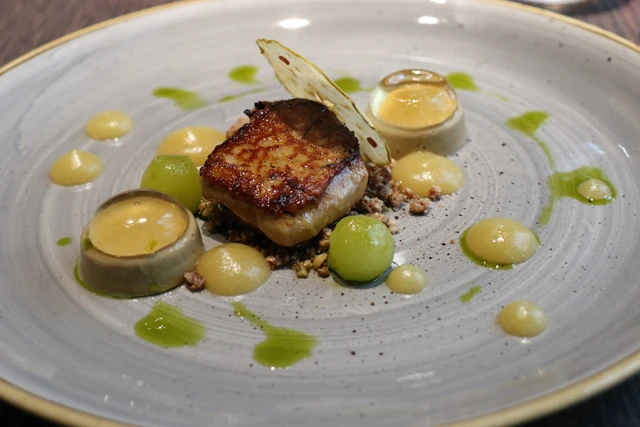 Előételnek végül kacsamájat kértünk, amelyet tokaji aszúval kínáltak. Persze mi is azt gondoltuk, hogy egy kis pohár bort hoznak mellé, de nem így történt. Egy apró buborékban a máj felett tálalták, így egyben kellett elfogyasztani. Aki még nem próbálta a máj-aszú párost, annak mindenképpen ajánlom, mert elképesztő ízélményt nyújt.