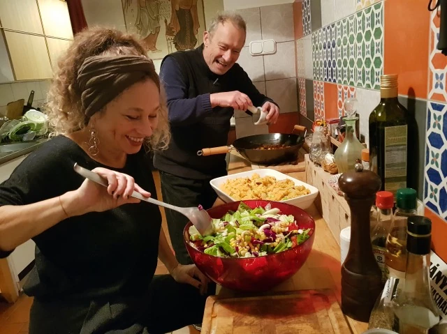 "Kezdetben csak magamnak főztem-sütöttem, ha nem sikerült valami, nem volt probléma. Aztán, mikor belejöttem, a család többi tagja is szívesen evett belőle" – meséli, hozzátéve, hogy a családjára, gyerekeire nem terjesztette ki a vegánságot, mert ez, mint mondja, az ő dolga, az ő útja. Mindemellett nemcsak jóízűeket esznek családtagjai az általa tálalt fogásokból, hanem az ételek elkészítésében is szívesen részt vesznek. "Két segítőm van, a feleségem, Gajzágó Donáta és egy régi zenésztársam, a Balkán FuTourist zenekarunkból Láng Katalin Bambi, aki maga is séfkedik a Három Holló kávéházban" – tudjuk meg a műhelytitkok egyikét, miközben fény derül több konyhai eszköz nélkülözhetetlen voltára is, amik az aprításon túli folyamatokat megkönnyítik. "Be kellett szereznem a botmixertől kezdve az aprítóig különböző gépeket, mert egy kávédarálót már tönkretettem az apró magok darálásával. Mikor elkezdtem áttérni a vegán főzésre, a vokos eljárások voltak az első nagy élmények. De azóta már berakom a sütőbe is a zöldségeket. Volt egy pont, ahol megálltam: olajban sütni falafelgombócot, zöldségeket? Minden tocsogott az olajban! Tényleg ez kell nekem? Nem sokkal jobb egy nyers saláta?! Volt, hogy visszahőköltem. Végül rájössz: ha berakod a hasábburgonyát a sütőbe egy sütőlapon, kicsit beolajozod a kezed és átfogdosod a krumplikat, tökéletes sült krumpli lesz, ugyanígy van a zöldségfasírtokkal is, bár azok kicsit szétesőbbek lesznek a sütőben" – tudjuk meg első kézből, hogy mit hol lehet elrontani. "Rendeztem egy főzőműsort, a Bűvös szakácsot. Láttam, mennyit foglalkoznak például azzal, hogy a paprika héját leégessék! Belemenni az egészen apró eljárásokba: a paradicsomot előbb megaszalni, a levét felfogni, azt félrerakni, visszavenni félóra múlva... Nem dobálsz be mindent együvé, ahogy a vokba, hanem az egyik serpenyőben elkészíted azt, a másikban amazt, a hozzávalókat elősütöd a sütőben, félóra múlva összeöntöd őket és berakod a párolóba. Bár bizonyos szerzetesi elképzelésekkel kezdtem a vegánságot, de rájöttem, hogy érdekesebbé teszi az ételt és az életet is ez az ínyenckedés..." – mesél a fine dining világgal való találkozásáról. A szerzetesi elképzelésekből a hagyományosan termesztett növényekhez való ragaszkodás megmaradt: a tartósításmentes alapanyagok beszerzése a növényi étrenden élőknek különösen fontos. Már jó néhány éve egy szigetmonostori, hetven családból álló közösség által fenntartott gazdálkodás a növényi alapanyagok nagy részének beszerzési forrása. "Ha egy, a miénkhez hasonló kisgazdaságot el tud tartani hetven család, azaz egy-egy ilyen gazdaság hetven családot el tud látni, akkor ezer kisgazdaság hálózata már olyan kapacitású lehetne, mint egy nagygazdaságé – annak minden nehézkessége nélkül. A "mi" hetven családunk gazdálkodója mesélte, mennyire megdöbbent, mikor felvették a kertészeti egyetemre, és az első órát a vegyszerekkel kezdték: mivel permetezzünk?! Az ő kérdése az volt: minek permetezzünk?" Nem meglepő módon kiderült, hogy a LaOci Konyha séfjeként maga is kísérletezik növénytermesztéssel, ami egy belvárosi lakásban számára a csíratermesztést jelenti. "Szeretem a csírákat, van saját ízük, nem lehet azokat elrontani. A retek a legegyszerűbb... Mikor a LaOci Konyhát kezdtem kiterjeszteni, kiengedni a lakásból, elterveztem egy internetes oldalt, ahol majd másokkal együtt fejtjük meg, mi az a szellemi bázis, ami a vegán védjegy mögötti tartalom lehetne. Rajta van az embléma a szupermarketekben egy-egy árucikken, azért gondoltam, hogy érdemes kicsit megkapargatni, mi mindent is jelent ez a vásárlóknak. Hogy például lehet-e gazdagítani ezt a mögöttes jelentést ünnepekkel, ünnepkörökkel?" Mint mondja, 1989-ben, mikor belevágott barátaival, művésztársaival, Kerényi Tódor Krisztiánnal és Július Gyula képzőművésszel egy összművészeti fesztivál szervezésébe a Pálvölgyi cseppkőbarlangban, úgy találta ki a Nap-Nap Fesztivál nevet, hogy már akkor az járt a fejében: vannak olyan globális, sőt univerzális természeti események, amelyek köré új ünnepeket lehetne szervezni. "Miért nem a napfordulókat ünnepeljük? Hiszen a civilizáció kezdete óta már voltak erre példák, a természetünnepek, tavaszünnep, termékenységünnep, és ott volt a növények által megszabott ritmus, az aratás időszaka, a vetésé." Mi lenne a vegán ünnepi menü főétele? "A gombából készült ételeket tartanám méltónak, a gomba ugyanis különleges, a természettudomány szerint is, egy tiszteletet érdemlő eukarióta. Nemcsak a kalapos gombákat, hanem a fermentáló, erjesztő-, élesztőgombákat is belekomponálnám az ünnepi ételekbe" – hozzátéve, hogy némi fejtörést okoznának azok a szigorú vegánok, akik azt mondják: gombát se! Hiszen a gomba nem növény, bár a növényekkel szimbiózisban él. De még az ünnepi ételeknél is fontosabbnak tartja, hogy szót ejtsünk a vegánsággal összefüggő etikai protokollról, aminek híján nincs például vegán szülészet, iskola, kórház. "A vegánoknál miért ne lehetne rá igény, hogy ne olyan tálba kapják az ételt – menzán, kórházban, börtönben –, amiben előzőleg állatzsír volt. Nekünk miért nincs lehetőségünk megválasztani, hogy mit eszünk és mit nem a közösségi étkeztetések során? Egy ilyen szolgálatot jó lenne létrehozni, ennek az intézményeit, protokollját kidolgozni."