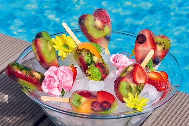 Vágd félbe a gyümölcsöket és helyezd őket sűrűn a forma oldalaira. Ahhoz, hogy még színesebb fagyikat kapj, használj vágott bazsalikomot vagy mentalevelet. A maradék részeket töltsd fel az édesítőszerrel összekevert kókuszvízzel, majd szúrd minden egyes fagylaltformába a pálcikákat. Hűtsd három négy óráig mélyhűtőbe helyezve a kókuszvizes fagylaltokat.