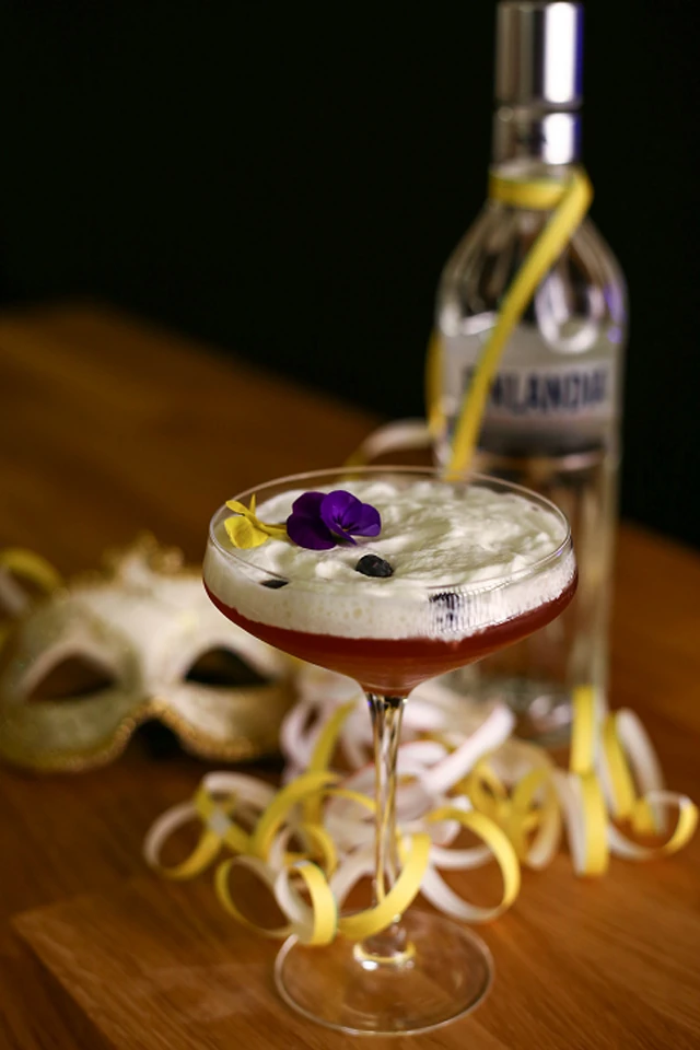 Hozzávalók: 4 cl Finlandia Blackcurrant Vodka, 1 cl grapefruit likőr, 1 cl meggy szirup, 1 cl limelé, 10 cl licsilé. Díszítés: ehető virágok, menta és ribizli