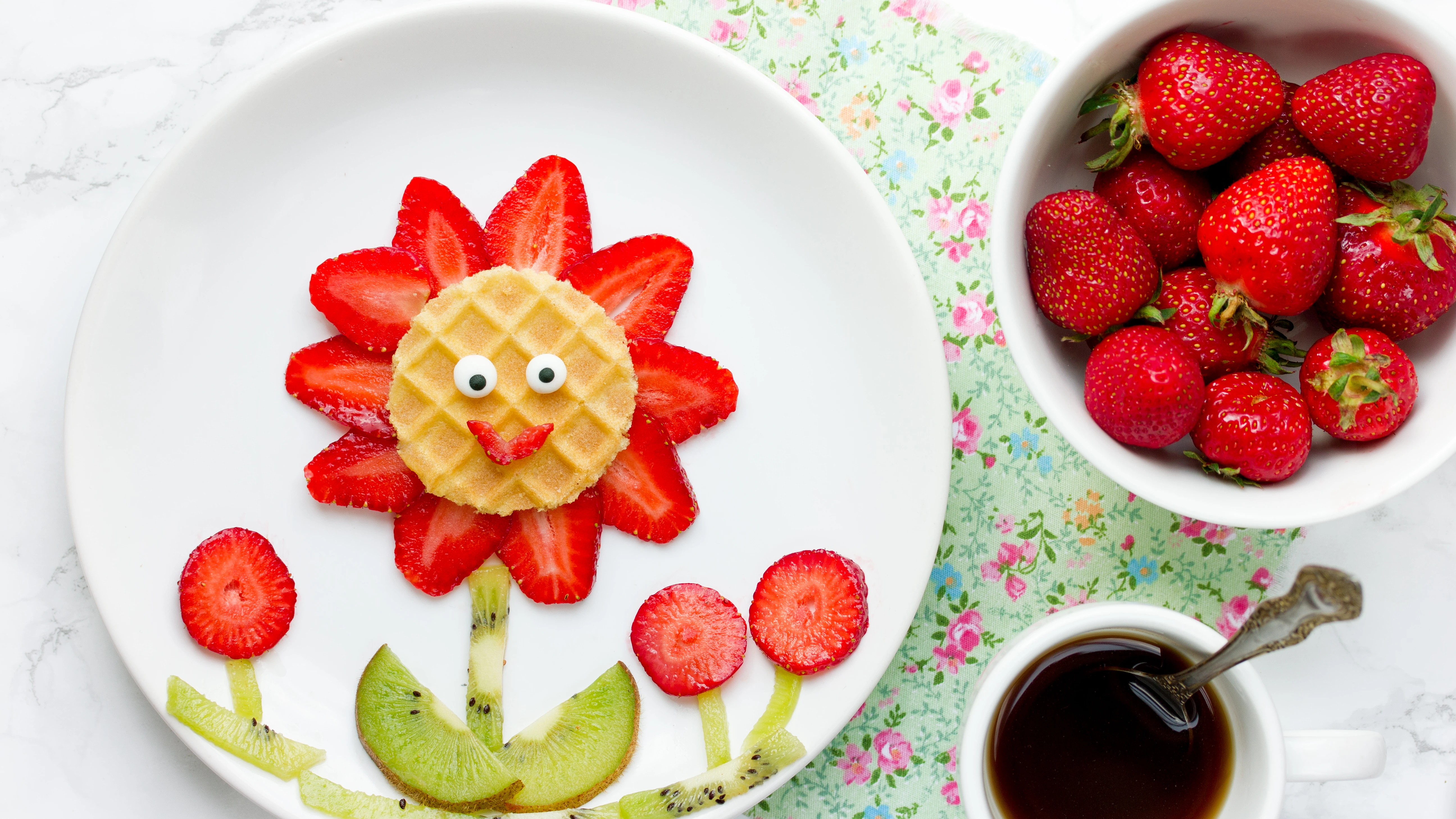 Mosd meg az epret, távolítsd el a zöld részét, vágj hosszában szeleteket belőle. Egy virág elkészítéséhez tíz szeletere lesz szükséged. Ha kész vagy, fogj egy másik epret, vágd karikákra, három darabra lesz szükséged. Amikor megvagy az eperrel, jöhet a kivi formázása. Ehhez nem kell más tenned vágj le egy karika kivit, szeld ketté. Egy másik szeletből formázz kisebb és nagyobb csíkokat. A kisebb verzióból háromra, az utóbbiból négy darabra lesz szükséged. Vágj le az étcsokiból két nagyon apró kb. fekete bors nagyságú darabot. Jöhet a formázás: fogj egy tányért tedd középre az ostyaszeletet, halmozd körré a hosszában levágott eperszeleteket. Készítsd el a minta alapján a kiviből a szárát és a többi apró virágokat is. A végén tejszínhabbal és az étcsokidarabbal készítheted el a szemet, egy apró eperszelettel pedig a virág mosolygós száját.