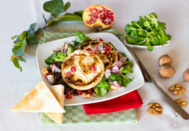 Hámozd meg, majd reszeld le az öntethez a hagymát. Keverd el az almaecettel, a citromlével és két kávéskanál vízzel, kevés sóval, borssal alaposan, dolgozd bele az olajat is, majd pihentesd a hűtőben kb. 15 percig. Főzd meg a salátához a vadrizst és hűtsd ki. Kapargasd a gránátalma magjait egy nagyobb tálba, ezután keverd össze a salátával, a dióbéllel, a vadrizzsel és tedd félre. Végül grillezd meg a sajtot, halmozd tányérokra a salátát, locsold meg az öntettel és tálald a sült sajttal.