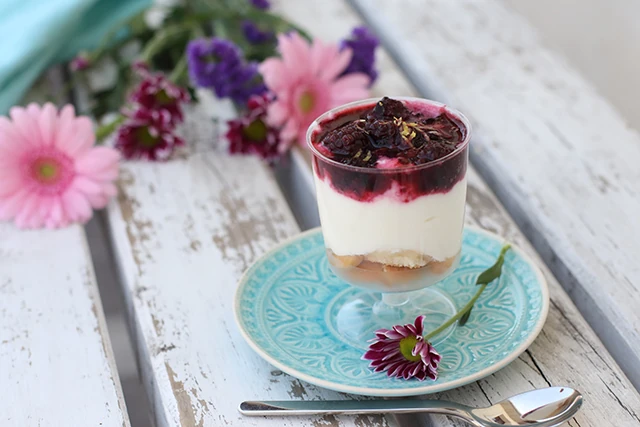 Facsard ki az előírt mennyiségű citrom levét. Keverd össze a cukorral és a görög joghurttal. Verd fel a tejszínt, add hozzá ezt is a joghurtos masszához. Főzd fel kicsit a gyümölcsöt, majd nyomkodd össze, várd meg míg kihűl. Készíts elő poharakat, mindegyik aljába tördelj egy kis babapiskótát, tedd rá a joghurtos krémet, a szederpürét és végül reszeld rá a citrom héját. Tálalás előtt hűtsd be legalább két órára.