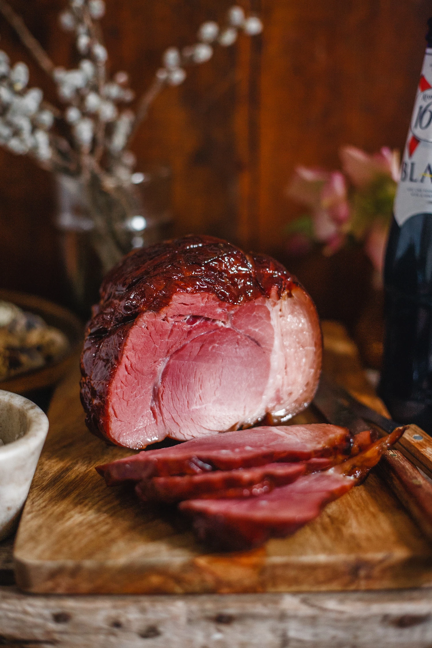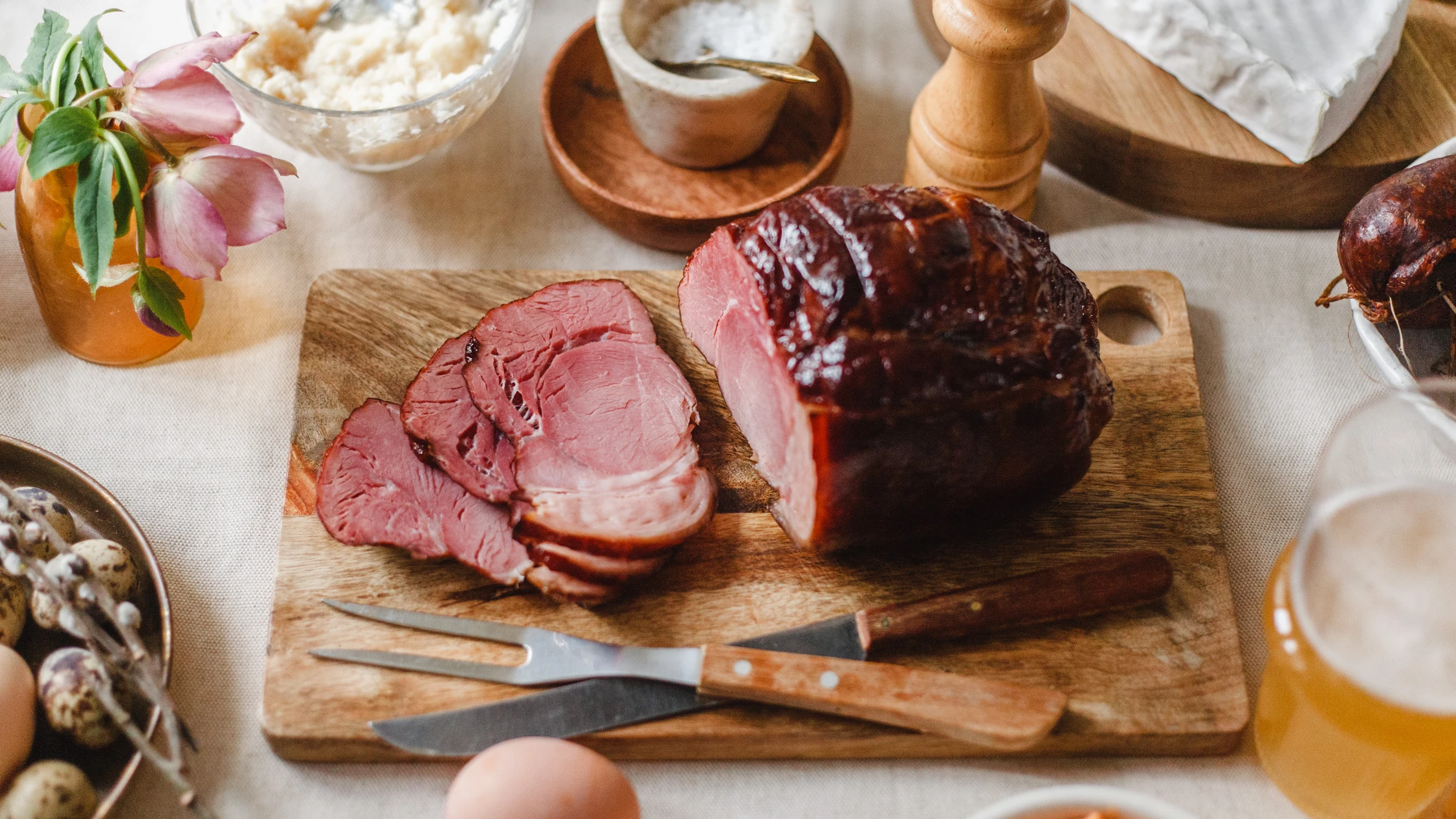 Hozzávalók a főzéshez: 1,5 kg füstölt, kötözött sonka, 5 dl Kronenbourg 1664 Blanc búzasör, víz, 3 db babérlevél, 1 teáskanál feketebors, 2 gerezd fokhagyma, 1 kis fej vöröshagyma A mézes-mustáros mázhoz: 2 evőkanál cukor, 1 evőkanál méz, 2 teáskanál mustár, 1 teáskanál alma- vagy fehérborecet