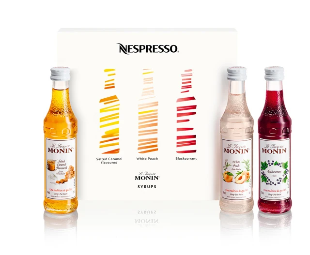 Ha pedig meg szeretnénk bolondítani a jegeskávénkat, a Nespresso a gourmet ízesítő szirupokat gyártó Monin márkával közösen egy limitált kiadású mini szirup szettet állított össze sós karamell, fehérhúsú őszibarack és feketeribizli ízekben, amit érdemes kipróbálni. Kísérletezésre fel!