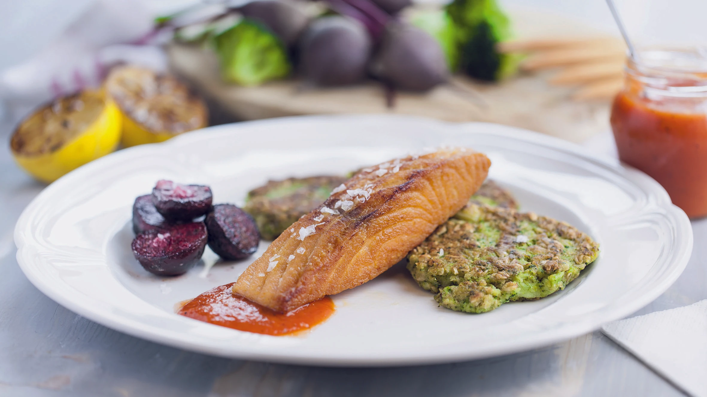 Lazacsteak, brokkoli ropogóssal, sült céklával, kápia paprika mártással