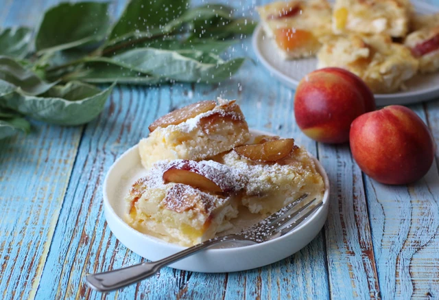 Hozzávalók: 15 dkg finomliszt, 1 csomag sütőpor, 4 tojás, 20 dkg kristálycukor, 3 dl tej, 15 dkg vaj, 50 dkg túró, 75 dkg őszibarack, porcukor a díszítéshez