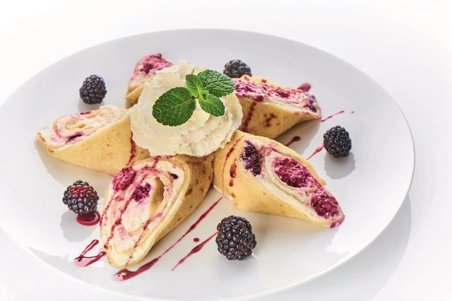 A palacsinta leeső szélét tedd a tányér közepére, és erre helyezd kör alakú szirmokban a tekercseket úgy, hogy a szederszemek szépen látszódjanak benne. A szirmok közepére fújj tejszínhabrózsát. Végül tegyél a tejszínhabrózsa közepére szederszemet, díszítsd mentával és áfonyaöntettel, szórd meg porcukorral.