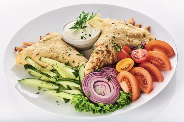 Merd egy keverőtálba a palacsintatésztát a petrezselyemmel és keverd el egy habverő segítségével. Süsd a tésztákat aranybarnára, majd készítsd el a grillezett csirkemellet. Szeleteld fel a húst, klopfold ki, fűszerezd be mindkét oldalát, süsd meg serpenyőben. Ha kész, vágd egy centis csíkokra. Szeleteld az uborkát vékony hosszú csíkokra, vágd ketté a koktélparadicsomokat, a lilahagymát pedig vékony szeletekre. A fokhagymás tejfölhöz keverd simára a tejfölt, add hozzá a fűszereket és a frissen préselt fokhagymát. A tálaláshoz terítsd ki a palacsintatésztát, középen függőlegesen vágd ketté. Helyezd a csirkemell csíkokat a fél palacsinta hozzád közelebb eső felére és tekerd két tölcsérré úgy, hogy a csirkemellek picit kilógjanak a tölcsér nyitott feléből. Helyezd a két tölcsért a zárt hegyeivel összeérintve a tányérra. Halmozd a salátaleveleket és a zöldségeket a tányérra. Szedd a tejfölt egy kis tálkába és helyezd a két tölcsér közé. Díszítsd friss petrezselyemággal és szórd meg petrezselyemmel.