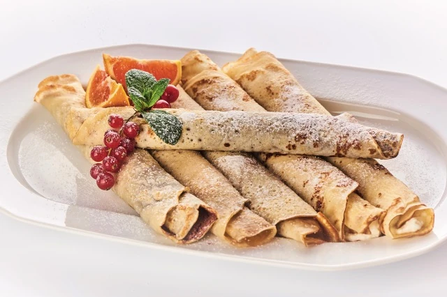 A vörösboros marhapörköltet juhtúrós palacsintatekercsekkel tálaljuk. A citrommal ízesített lazacderék, spenótos palacsintafészkeken kerül a tányérra, amit leöntünk egy kapros tejszínes-citromos mártással. Ahogy az osztrákok is, mi a húslevest tészta helyett palacsintatésztával tálaljuk. Rengeteg ízesített tésztánk van, melyeket mindenféle édes különlegességgel és gyümölccsel párosítunk. Nagyjából 150 állandó receptünk van, folyamatosan cseréljük az étlapot.