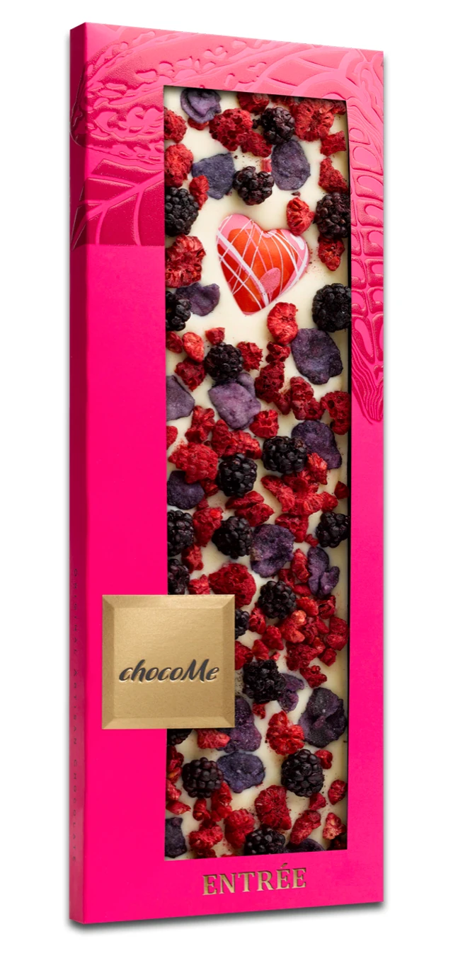 A csábítás igazi megtestesítői az exkluzív, desszertszívvel díszített, táblás csokoládé-trió darabjai, melyek esetében már az élénk pink színű elegáns csomagolás is védjegye a tökéletes ajándéknak. A táblákban a szenvedély ősi alapszíne is főszerepet kap a piros, illetve bogyós gyümölcsök életteli tónusával: a vörösáfonya, a liofilizált eper és a rózsaszirom nem csak ínyencségek, de valódi afrodiziákumokká is válnak, a selymes tej- ét-, illetve fehércsokoládé ölelésében.