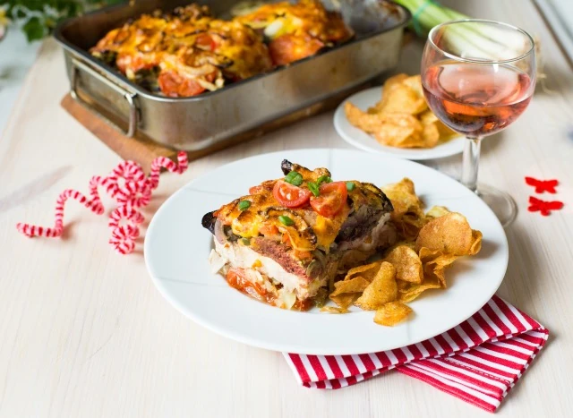 Tepsis lecsós csirkecomb csirkemájjal és burgonya chips-szel