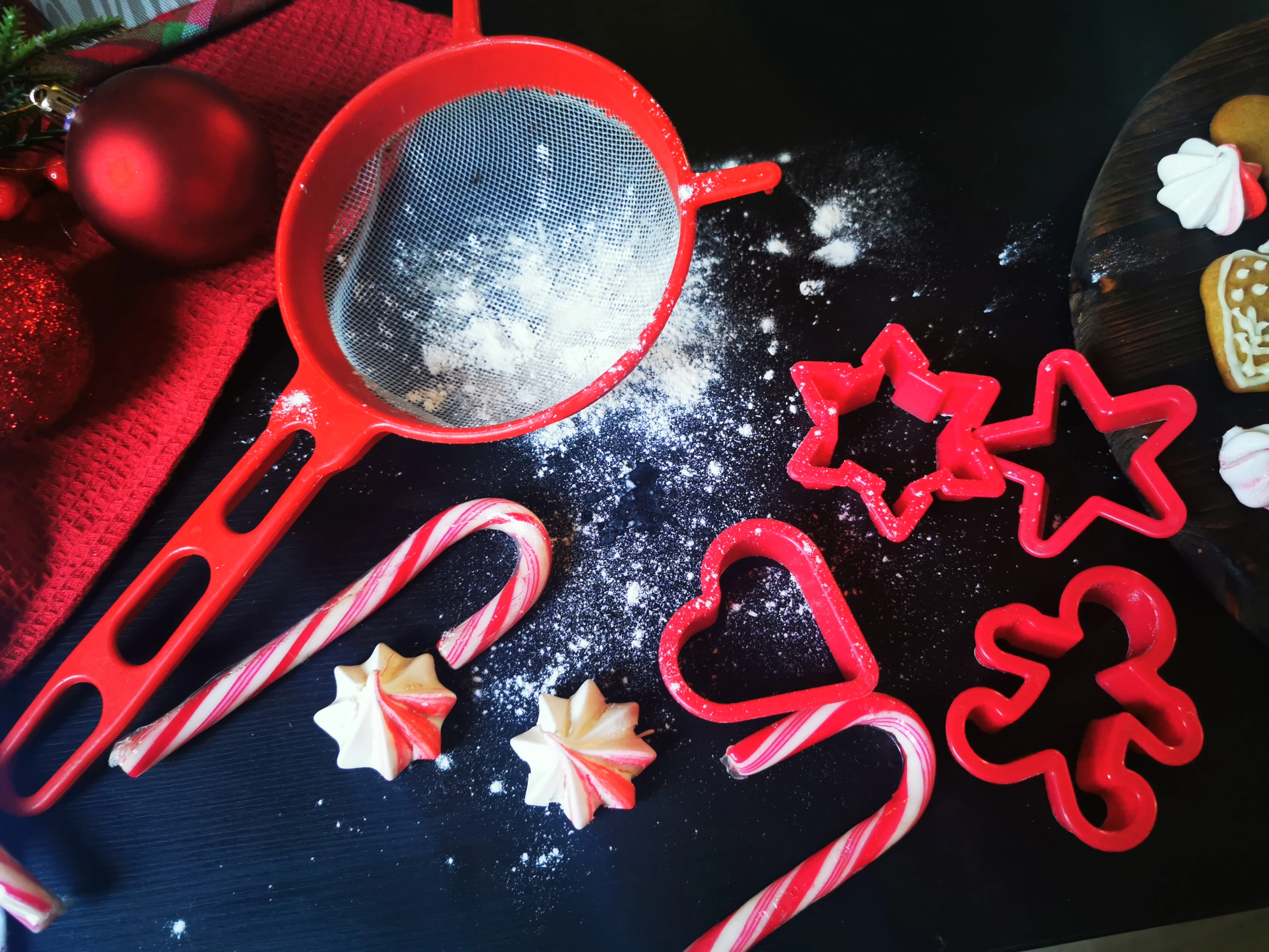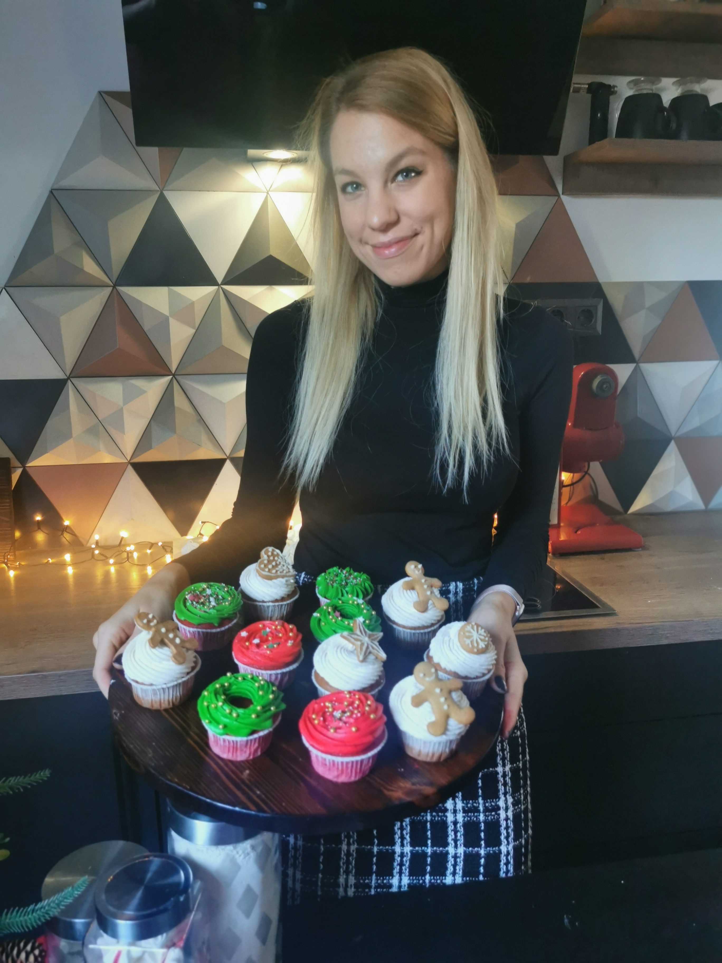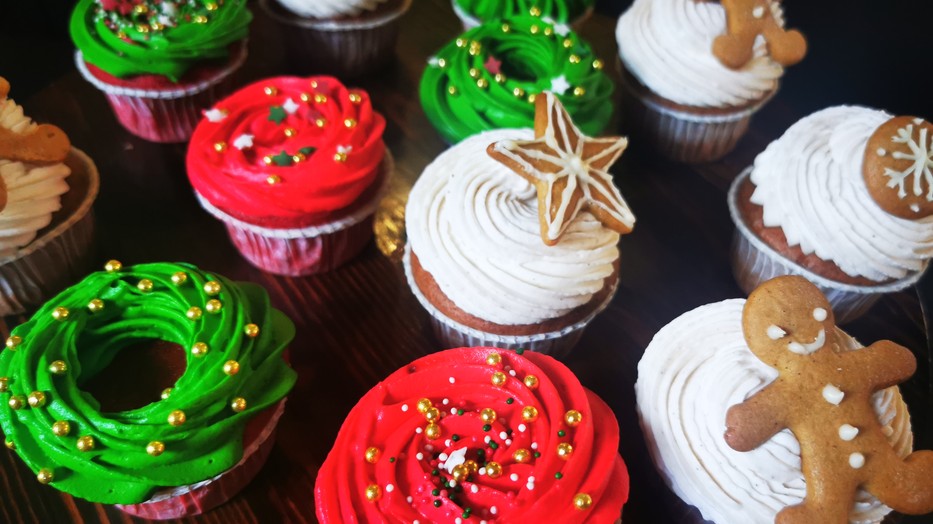 Hozzávalók 16 kisebb darabhoz: 240 g liszt, 150 g natúr joghurt, 170 g cukor, 1 csomag vaníliáscukor, fél csomag sütőpor, 3 tojás, 100 g vaj olvasztva, piros ételfesték. A krémhez: 400 ml habtejszín, 400 g mascarpone, 50 g porcukor, színes ételfesték. A tetejére: cukorgyöngyök, mézeskalács figurák