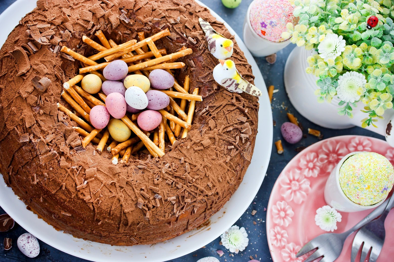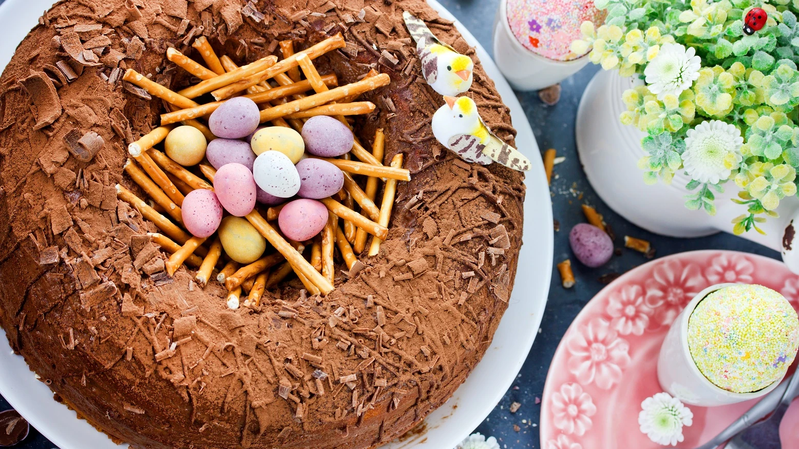Garantáltan óriási sikere lesz ennek a rém egyszerű tortának, amihez szintén a fentebb említett tojásdrazsék, tojáscukorkák kellenek. Készíts egy sima csokis piskótát kerek tortaformában, majd vágj egy nagyobb mélyedést a közepére! Ebbe jöhet a fészek, amit sós pálcikákkal és a kis tojásokkal rakj ki a képen látható módon. Ha gondolod, előtte öntsd le az egész tortát csokiöntettel, végezetül pedig csokireszelékkel, csokiforgáccsal teheted egy kicsit rusztikusabbá a tortafészket.