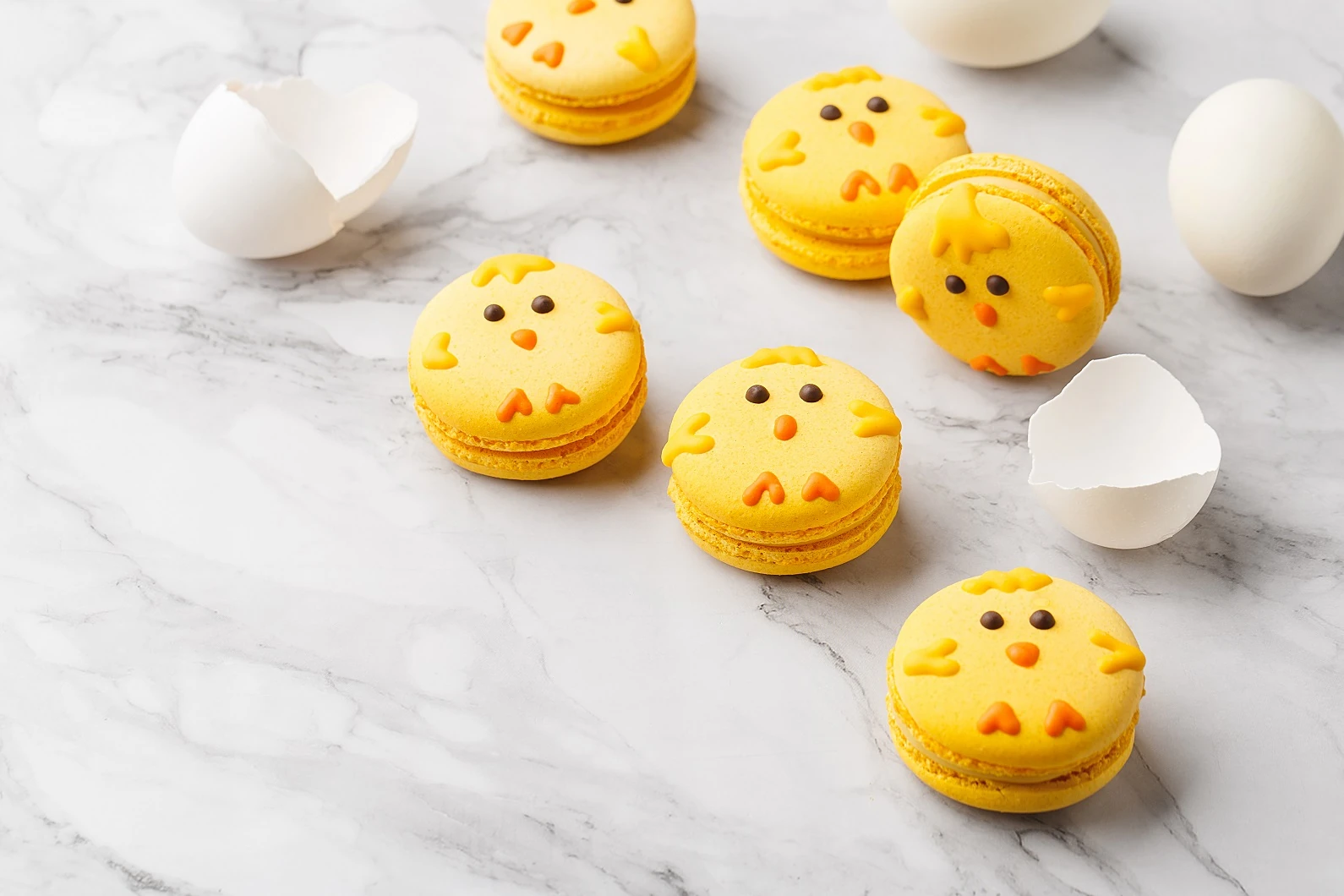 Ha tudsz és szeretsz dekorálni, és akkor poénos desszertötletként itt van még egy tuti megoldás: szerezz be sárga színű macaronokat, és dekoráld őket kiscsibékké!