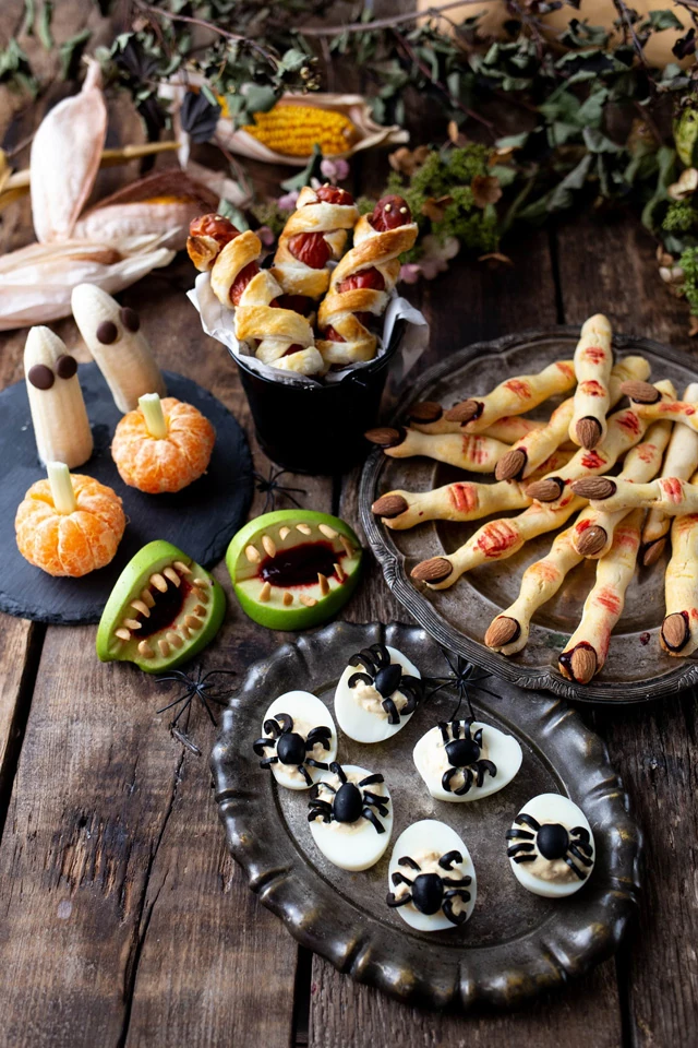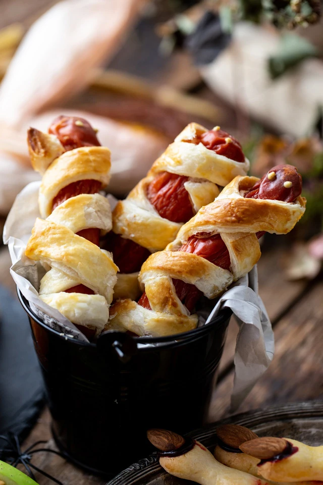 Készíthetünk olyan ételt, amit a hétköznapokban is szoktunk, csak most legyen halloween-os a díszítés, a forma és a tálalás. Találjunk ki különféle fantázianevet a finomságoknak, így még izgalmasabbá válik az ünnepi menünk. Hiszen ki tudna ellenállni például ezeknek a virsli múmiáknak, amelyek valójában levelestésztába bújtatott virslik egy kis ketchuppal megbolondítva.