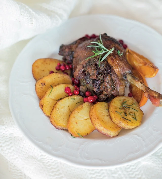 Vörös áfonyával töltött kacsacomb sült rozmaringos burgonyával, vörös áfonya-szósszal