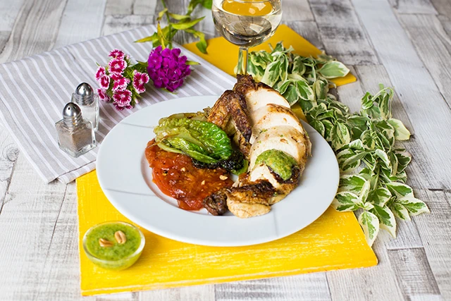 Vasalt csirke grillezett római salátával és paradicsommal, petrezselymes pestoval