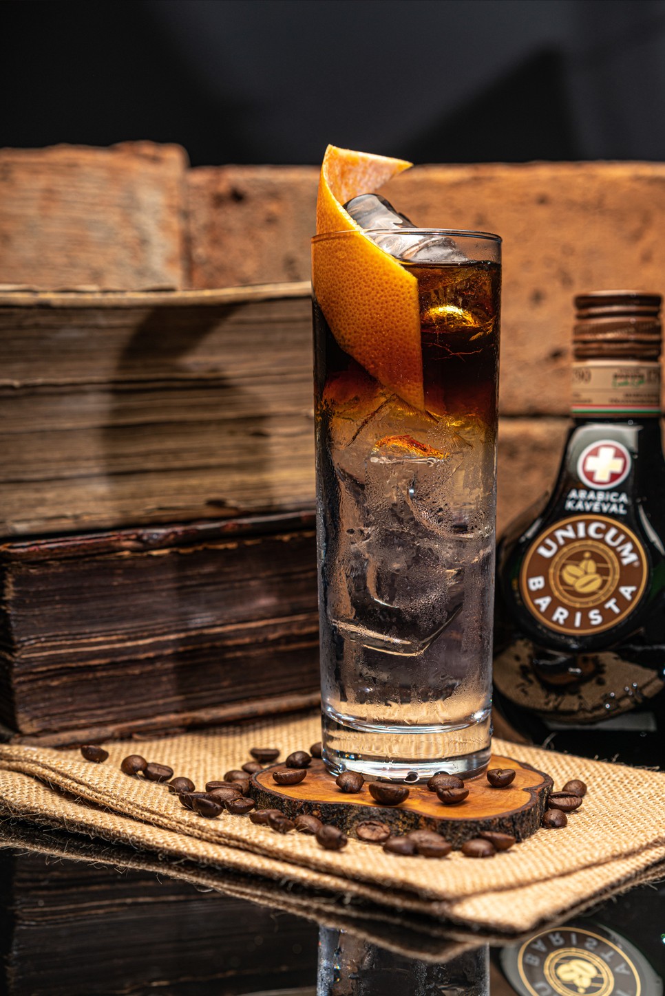 Hozzávalók: 40 ml Unicum Barista, 10 ml cukor, jég, a díszítéshez: narancs peel